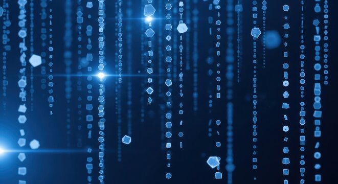 Abstract binary code and geometric shapes on dark background