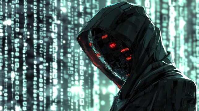 A hooded person with a serious expression gazes forward surrounded by falling binary code in a dark futuristic setting