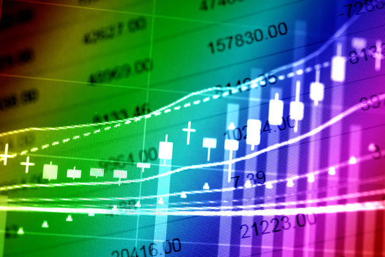 Coding concept. Charts of financial instruments with various type of indicators including volume analysis for professional technical analysis on the monitor of a computer. Software log in linux.