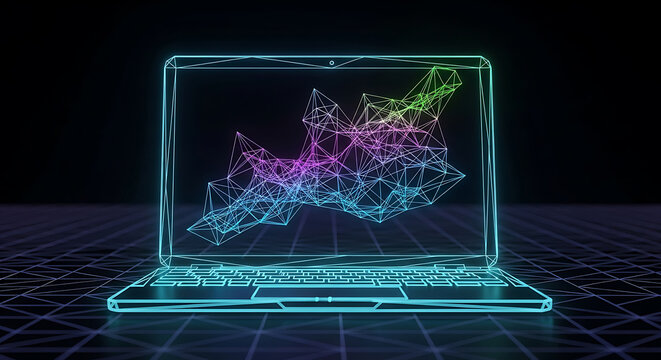 Abstract glowing neon data visualization on a futuristic laptop screen against a dark background