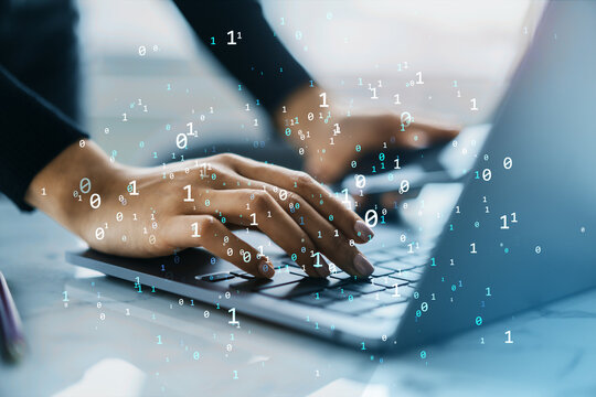 Person working on laptop with digital binary code overlay in modern office environment, symbolizing data, internet, and cloud technology concepts.