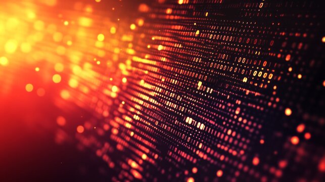 An abstract digital interface displaying a pixelated data stream with glowing binary code elements in red, blue, and orange hues