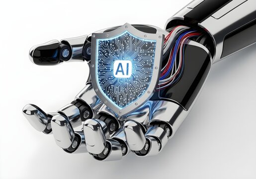 Cybernetic hand holding a shield icon with embedded AI circuits, glowing softly, isolated on white.