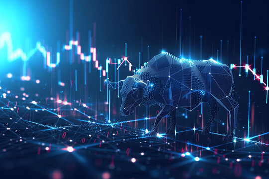 Three colorful cryptocurrency coins in front of a digital financial market graph with trend lines and data visualization on dark background