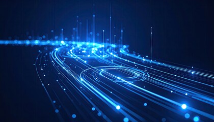 Background with glowing light blue and green lines, particles of data flowing in the air, abstract digital technology network, futuristic data visualization, motion energy concept