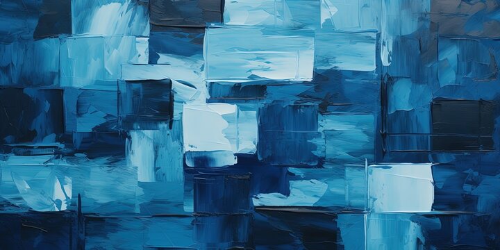 Closeup of abstract rough dark blue black art painting texture, with oil acrylic brushstroke, pallet knife paint on canvas, geometric spatula technique with rectangles