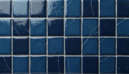 Cracked blue ceramic tiles texture. Glossy square mosaic surface in dark navy and indigo shades. Elegant geometric grid pattern forms a stylish abstract background for home decor and interior design.