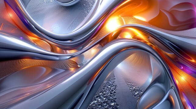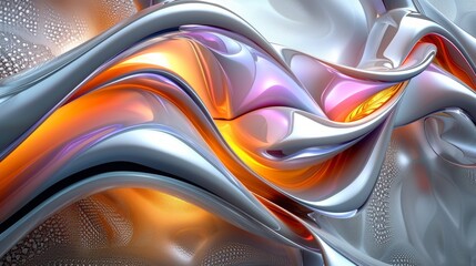 Abstract composition of curving, flowing shapes in metallics and glowing blue-gray, yellow, orange and pink. Could be metal or plastic or liquid
