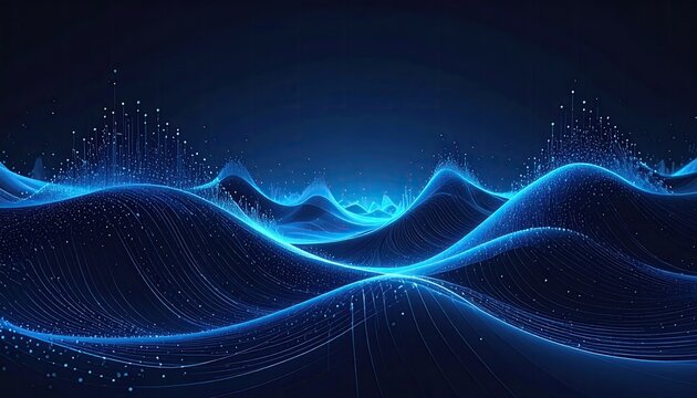 Digital art featuring glowing blue lines forming undulating waves against a dark backdrop