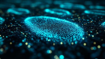 Abstract digital fingerprint, glowing blue particles on dark background.