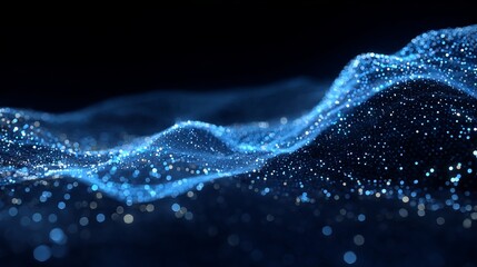 Abstract blue wave pattern with glowing particles on dark background