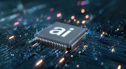 Close-up view of a computer processor chip with "ai" in white font, set on a circuit board
