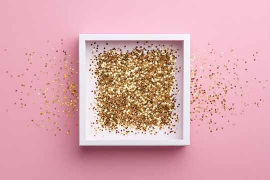 A square white frame filled with gold glitter sits on a pink background, with scattered glitter