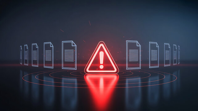 Glowing red exclamation mark warning sign in triangle surrounded by digital circuit board elements on dark background
