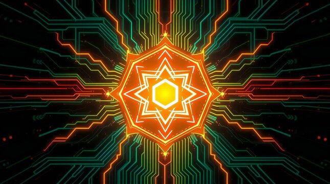 Glowing geometric pattern with circuit board design in orange green and yellow colors on black background
