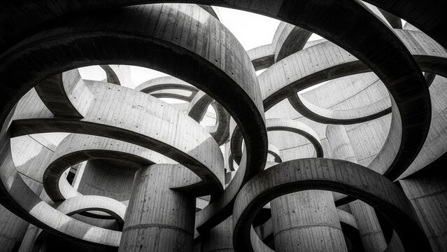 Monochrome Abstract Concrete Spirals, Brutalist Architecture, Geometric Patterns, Urban Design