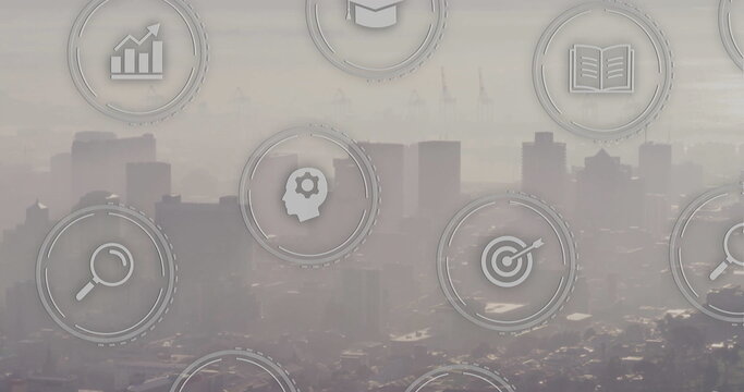 Overlaying icons including magnifying glass and graduation cap over hazy city skyline
