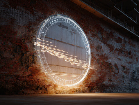 Abstract scene featuring a glowing round interface over a weathered brick wall. Conceptual for data, technology, progress, or disruption. Evokes mystery, future, and urban exploration.
