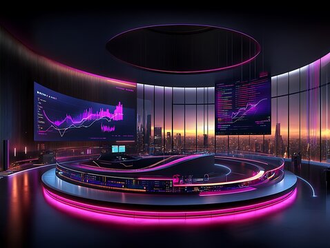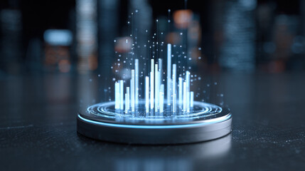 Futuristic holographic display showcases vibrant data visualizations, with glowing bars representing various metrics. sleek design and illuminated elements create captivating technological