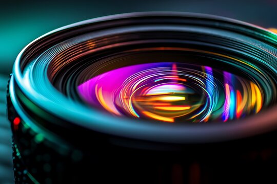 Camera lens reflecting a spectrum of vibrant colors and dynamic light streaks, capturing a sense of energy and movement