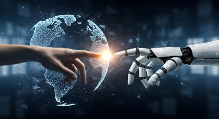 Human and Robot Hand Touching Over Digital Globe Concept in Dark Blue Background