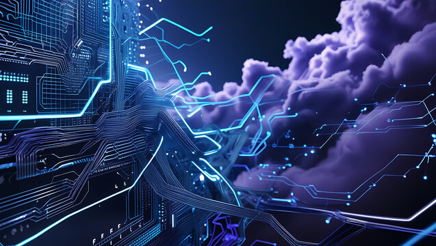 Futuristic Technology with Circuitry and Cloudscape Creates a Digital Realm