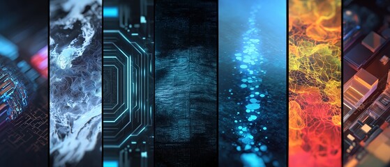 A digital collage featuring abstract technology and data visuals with futuristic circuits, liquid effects, neural networks, and glowing particles in vibrant colors.