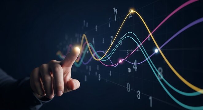 Hand interacting with colorful data visualization on dark background for analytical insights