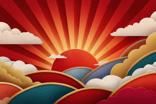 Sunrise over colorful abstract hills with clouds and radiant red sky artwork
