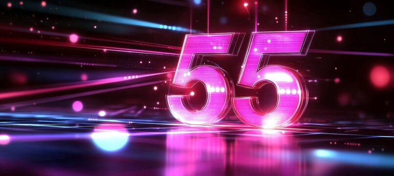 Glowing Digital 3D Number 55 In Futuristic Style With Neon Lights And Bokeh On Abstract Background