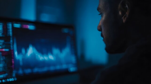 A person intently observing financial data charts on a computer screen in a dark blue lit environment