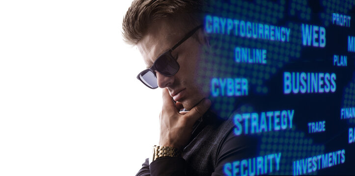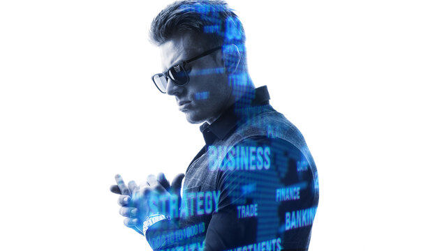 Double exposure portrait of guy on white background. Man in classic suit. Cryptocurrency, finance, business, innovative ideas concept. Futuristic holographic interface to display data.