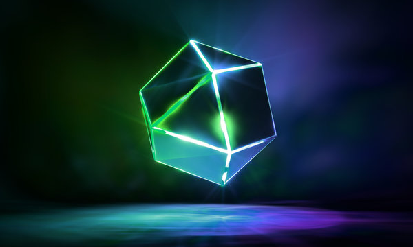 Futuristic neon glowing cube in tech environment