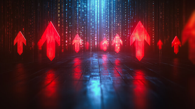 Digital Arrows Rising Through Binary Code and Glowing Light