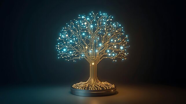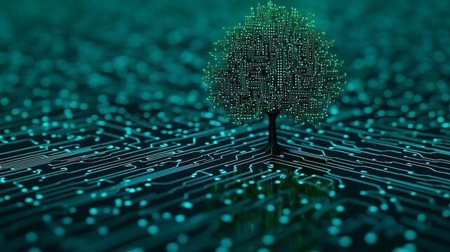 A digital tree composed of circuit patterns stands out against a tech-inspired background, blending nature and technology.