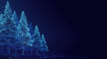 A futuristic forest of illuminated trees stands, their digital forms glowing softly against the night sky. ..Created with Generative AI, not depicting real subjects.