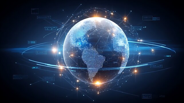 Global digital network and data connections on futuristic virtual Earth – high-tech communication and cybersecurity concept