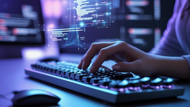Female Coder Typing with Futuristic AI Holograms – Tech Workspace, Glowing Code and Innovation.