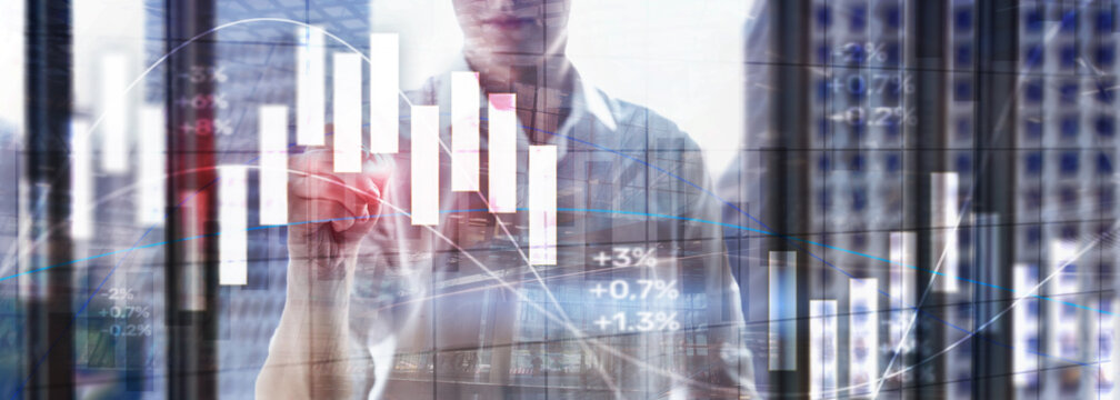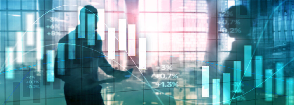 Abstract 3D rendering of stock market data and digital information flow. Ideal for financial technology presentations or website backgrounds.