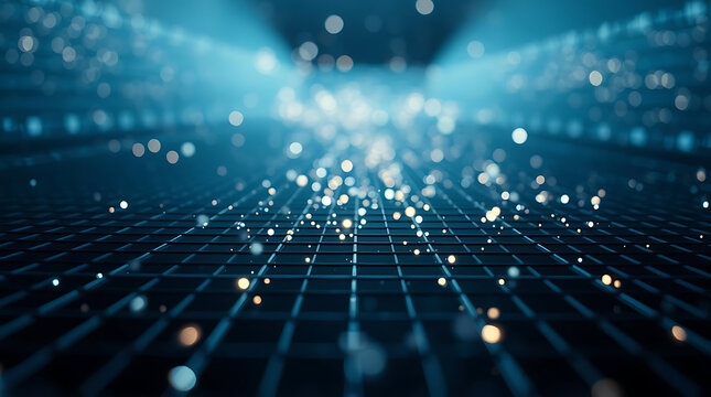 Abstract digital grid with glowing blue particles and bokeh lights in a futuristic technology concept background