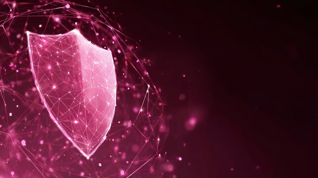 Cybersecurity shield protecting digital networks with vibrant pink glowing connections and polygonal mesh in virtual space, a modern concept