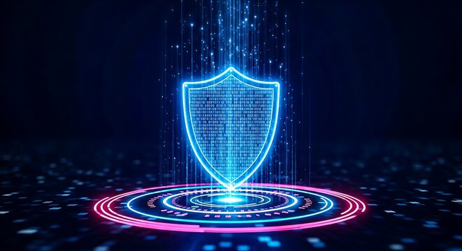Glowing neon shield symbol representing cybersecurity and digital protection