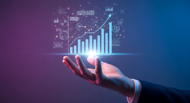 Futuristic Holographic Data Visualization in Hand with Charts and Graphs