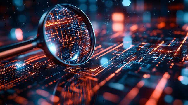 Close-up of a magnifying glass over digital data search