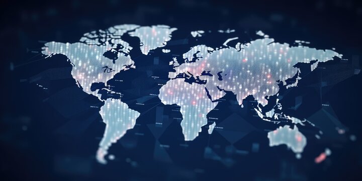 Digital world map with glowing cyber data points on dark blue background. Global connectivity and internet technology concept. Design for network, communication, technology innovation theme. AIG35.