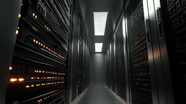 Modern data center interior with rows of server racks