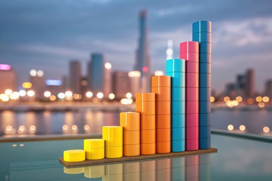 Digital abstract graph shows upward trend with glowing bars representing city buildings. Futuristic line chart indicates economic growth and success.