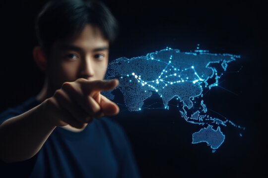 Young man interacting with virtual map of Asia, showcasing digital connections and data flow, illustrating technology, innovation, and global connectivity in modern society.