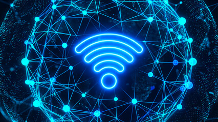 Glowing blue neon wifi signal icon illuminates a complex, interconnected digital sphere representing global wireless data transfer and abstract network technology concepts.