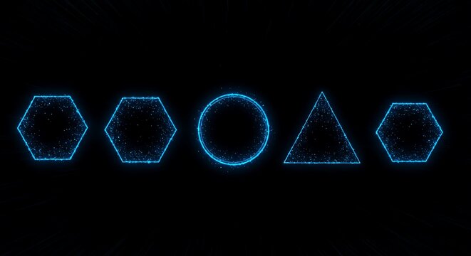 A set of four luminous blue geometric shapes, including a hexagon, circle, triangle, and pentagon, glowing with a particle effect against a dark background.